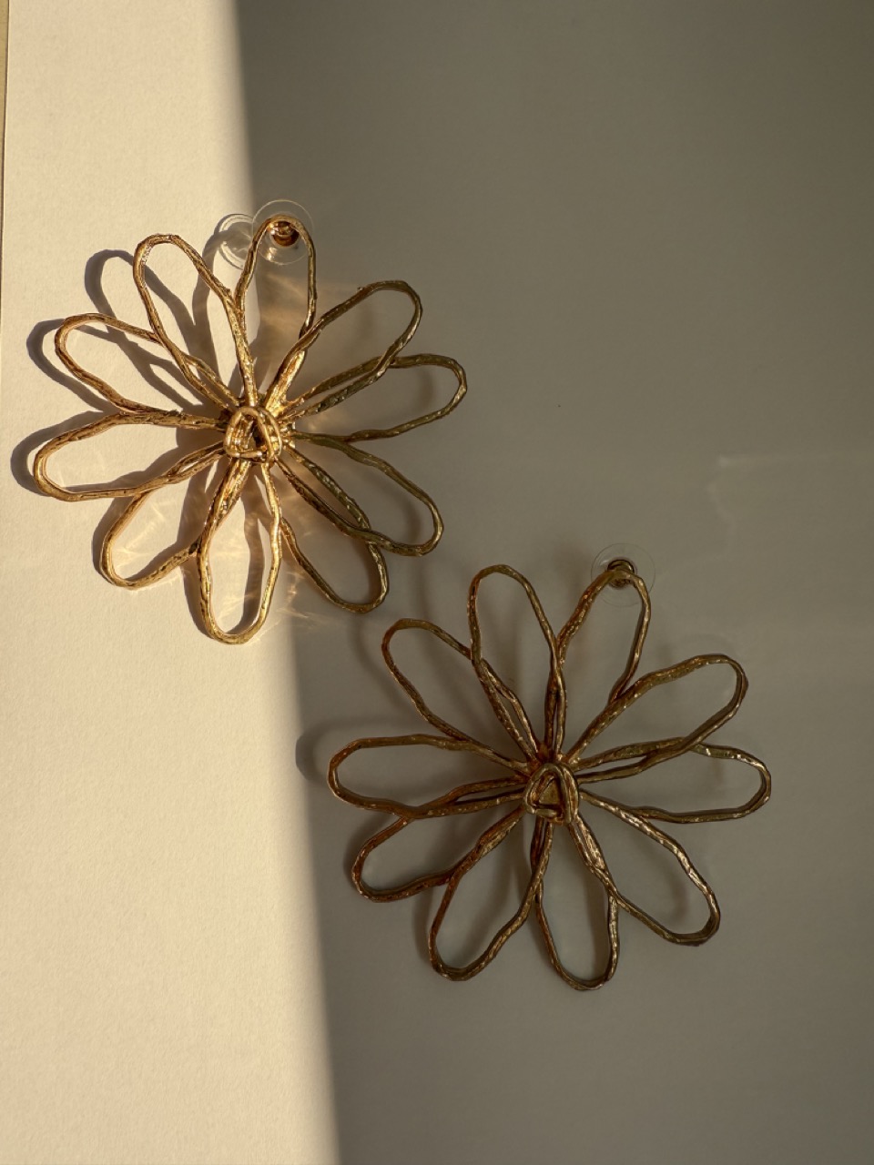 Brinco de flor dupla, sendo a parte de cima maior e debaixo menor, dourado fosco.