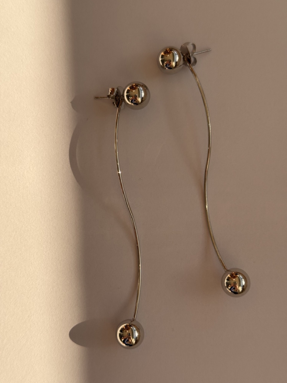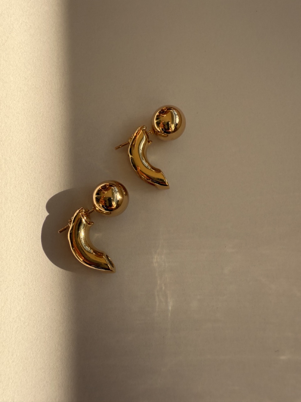 Brinco possui duas partes: a primeira é uma esfera fixa, e a segunda complementa a primeira com um design em fio curvo e esfera na extremidade, que se encaixa no pino.