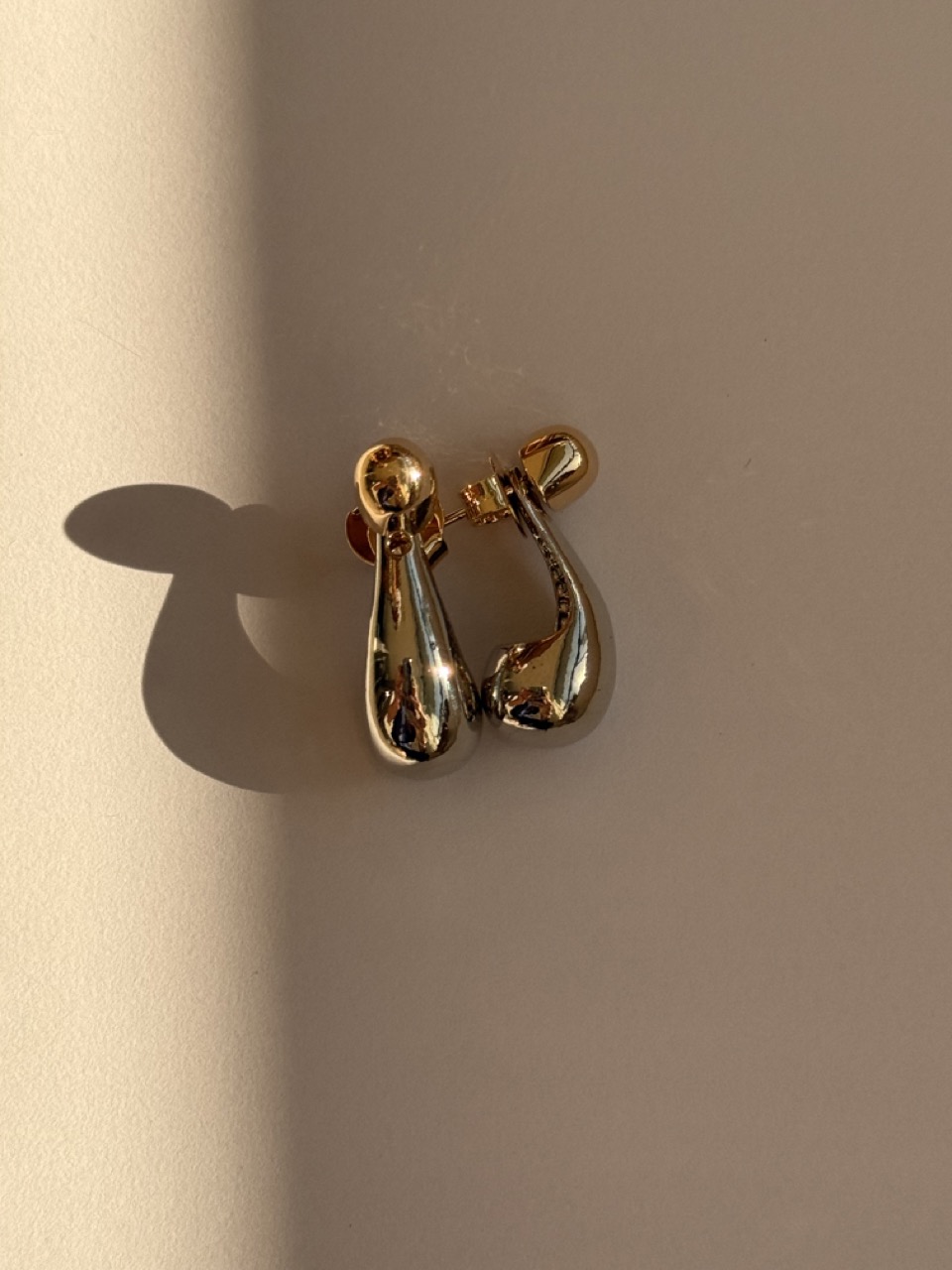 Brinco pequeno fixo dourado redondo, e segunda parte em prata que encaixa em formato de gota.