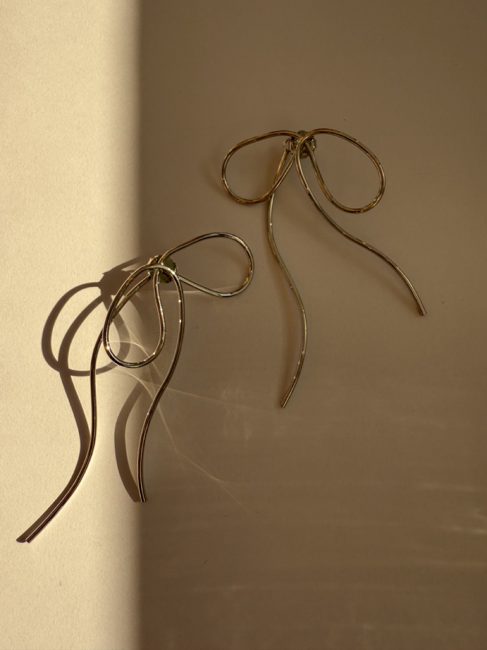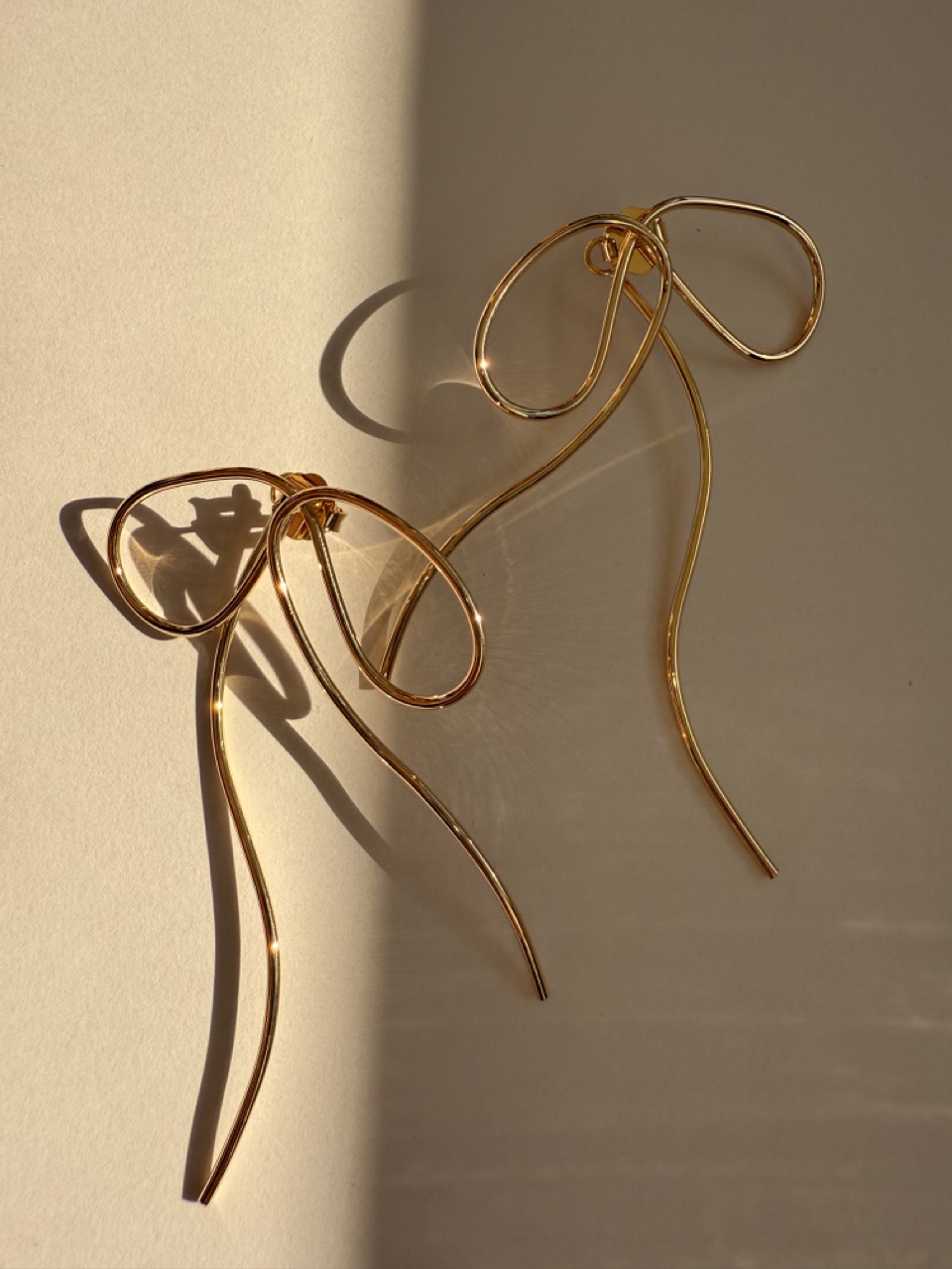 Brinco fio liso, com aparência de “laço caído”, tarraxa com parte embutida nele.